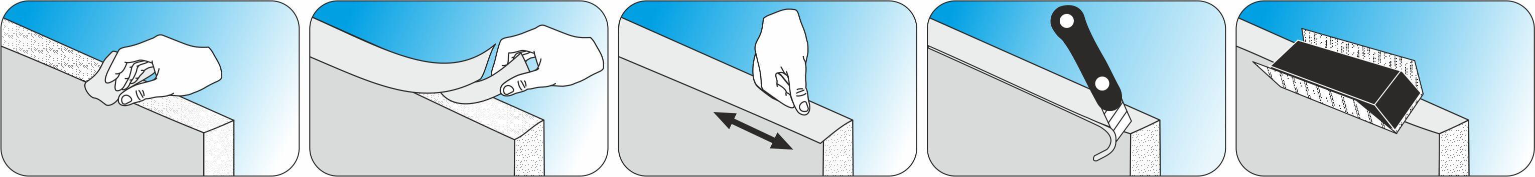 - Нанесение ленты. Отделите часть подложки, обнажив клеевой слой. Приложите кромку к торцу детали. С обоих сторон должны свисать небольшие куски.